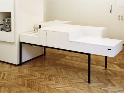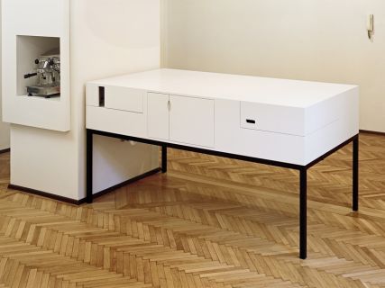 Ein Tisch verändert seine Form. Aus der schlichten Kubatur wird durch wenige Handgriffe ein spannendes Volumen mit vielfältigen Funktionen. Neben der Kaffeemaschine situiert, enthält der Tisch Miniwaschbecken, Minikühlschrank und Fächer für notwendige Utensilien. Der Tisch ist Kleinküche und Kommunikationsmittelpunkt im Büroalltag sowie Empfang und Bar bei besonderen Anlässen. In Farbe und Design nimmt er das Gestaltungskonzept des Büros auf und fügt sich selbstsicher in die bestehende Gründerzeitarchitektur ein.