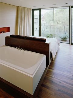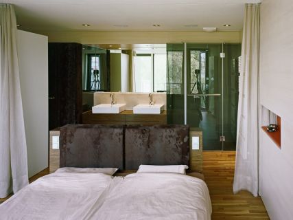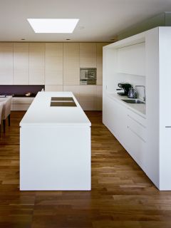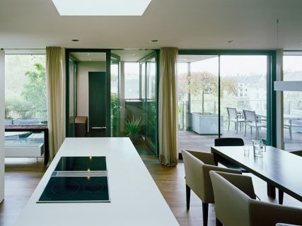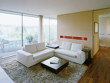 Für ein Penthouse wurde die Inneneinrichtung gestaltet um das luxuriöse Raumgefühl des offenen Grundrisses zur Geltung zu bringen. Als Hintergrund dient ein raumhoher Schrank entlang der Längsseite vis-a-vis der transparenten Fassade zur Terrasse. Ein schleiflackiertes Element aus Küche, Wirtschaftsraum, Ankleide trennt Wohnen und Schlafen. Der Schlafbereich bietet kleinen feinen Luxus durch ein offenes Bad und dunkle Felloberflächen. Der flächige Einsatz von Harthölzern an Boden, Wand und Möbel mit nur wenigen farbigen Stoffintarsien und ohne auffällige Details erzeugt einen bewusst zurückhaltenden Charakter.
