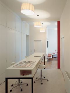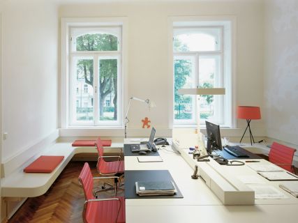 Aufgabe waren Umbau und Gestaltung einer Altbauwohnung zum Sitz eines Beratungsunternehmens für strategische Kommunikation. Wunsch war neben der Berücksichtigung des Firmen-CI und der repräsentative Qualität für Kunden auch qualitatives Ambiente für die MitarbeiterInnen. Als Idee wurden die klassische Form von Büroarbeitsplätzen aufgelöst und Tische in Raummitte situiert. Ergänzt mit einem umlaufenden Band als Sitzbank, Ablage, etc wird der Tisch als archischer wie auch zentraler Mittelpunkt von Kommunikation inszeniert. Bei der Gestaltung wurde die Struktur der traditionell großzügigen Räume des Altbaus respektiert und das Ambiente durch die Auswahl von zeitlos anspruchsvoll gestalteten Mobiliar unterstützt.