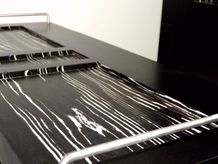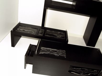 Für das neue Interieur eines Lofts wurde ein dreiteilbares Möbel entworfen. Es ist Stehbar, Couchtisch und Tablett für Frühstück im Bett. Die Farbgebung und Oberfläche mit schwarzer Furnier und Zebrano-Intarsien orientiert sich an den sonstigen Möbeln, Stoffen und Accesoires die als Ornament oder Uni bewusst ausgewählt sind. Ineinandergestellt ergeben die drei Teile einen raumbildenden platzsparenden Quader. Als Einzelteil verwendet birgt die Stehbar Fächer für Küchenutensilien, der Couchtisch bewegt sich auf Rollen und das Tablett für Frühstück im Bett kann auch als seitliche Ablage gestellt werden. Griffe, Mulden und Schubladen in jeweils individueller Art und Position machen alle Teile für sich praktisch und vielfältig nutzbar.